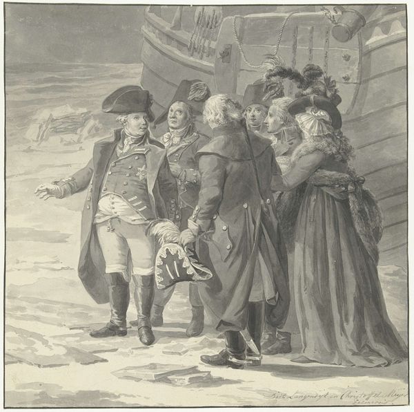 Editor: Here we have James Ward's "Victory of Lord Duncan," a print of indeterminate date, held at the Harvard Art Museums. It has a tumultuous feel, with all these figures in the foreground and a battle raging in the background. What stands out to you? Curator: It's interesting how Ward juxtaposes the supposed 'victory' with the visible suffering of the sailors. Consider the sociopolitical context: naval victories were often used to promote nationalistic fervor, masking the brutal realities of war and the exploitation of the working class. Do you see any evidence of that here? Editor: Yes, the injured sailors seem almost an afterthought. What does that say about how war was viewed at the time? Curator: Exactly! It challenges the romanticized narratives of heroism. Who benefits, and at whose expense? Ward's work invites us to critically examine power structures. Editor: This has given me a lot to think about. Thanks for your insight. Curator: My pleasure. I hope it helps connect art history to the world around us.