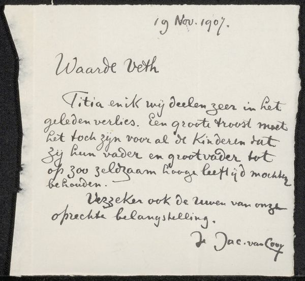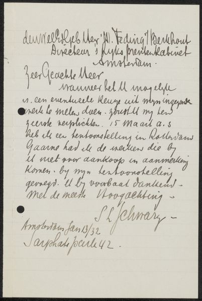 Curator: Looking at this pen and ink drawing by Dick Ket, possibly from 1939, which resides here at the Rijksmuseum, one is immediately struck by its raw intimacy. The drawing is titled “Brief aan Mien Cambier van Nooten.” What's your initial impression? Editor: It’s certainly intense. The script feels crammed and energetic, the pen strokes so direct—almost confessional, visually loud. Curator: Yes, there's a powerful presence of the artist revealed in the lettering, particularly the emotional dynamic conveyed in his script. Editor: Letters have often fulfilled crucial roles in cultural history, acting as a conduit for expressing and solidifying opinions among a select segment of society during a specific timeframe. This text itself represents the intimate connection that Dick Ket shared with Mien Cambier van Nooten. Can you elaborate? Curator: Well, the act of handwriting itself, using ink and pen on paper, possesses inherent psychological implications and weight. In essence, Ket leaves an actual trace, a record. The letter, like the drawings and still lifes for which he’s best known, invites reflection. He uses visual cues to convey specific sentiments or even allusions to other people—his art seems to become a stage. Editor: It makes me consider who Mien Cambier van Nooten was. Someone who seems to inspire an urgent need for dialogue. To know he felt so comfortable revealing so much in this brief note, that tells me volumes about their shared connection. It must have had such public, yet completely secret implications! Curator: I concur. The drawing’s historical setting is also of immense relevance. Take the date; assuming that 1939 timestamp to be correct, it marks the period directly preceding the commencement of World War II. Thus, even a relatively mundane artifact such as this communication with Cambier acquires layers of significance when observed from an angle sensitive to historical context. Editor: Looking closely at the flourishes of the writing—the deliberate way certain words are emphasized—it seems charged with emotions, mirroring the world, on the verge of turmoil. And perhaps reflecting his own health issues? Curator: Indeed, a fragile state manifested boldly through imagery and word; this letter encapsulates personal burdens amplified by broader historical currents, made permanent. Editor: I feel like I've gained a better understanding not only of the artwork but of Dick Ket’s existence as an artist in that turbulent epoch. Thank you for pointing out details that bring that historical weight to light.
