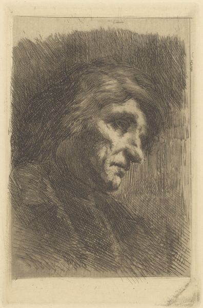 H.E. Wissmann created this etching, titled "Portret van een onbekende oude man," which translates to "Portrait of an unknown old man." The print captures the essence of aging and anonymity, inviting us to consider the stories of those often overlooked by history. Wissmann uses the etching technique to create a somber mood, with the subject emerging from a dark background. The man's worn features and humble attire suggest a life of labor and hardship, reflecting the realities of the working class in the late 19th or early 20th century. This portrait departs from the tradition of depicting nobility or the bourgeoisie, which were the typical subjects, turning our attention to the common man. The lack of specific identity amplifies the portrait’s impact, prompting us to reflect on the value and dignity inherent in every human life, regardless of status. The image evokes both a sense of empathy and a moment of connection with a life unknown.