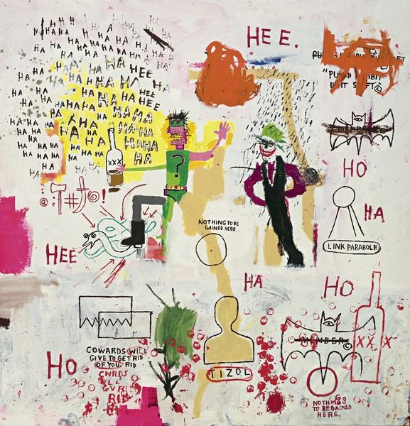 Curator: We’re now in front of Jean-Michel Basquiat’s compelling "Untitled," created between 1981 and 1982. The piece incorporates mixed media, acrylic paint, and drawing, reflecting the vibrant Neo-expressionist style that Basquiat helped pioneer. Editor: It’s…chaotic. My eye is drawn immediately to the figure on the right, a sort of seated skeleton against that jarring yellow background. There's such rawness to the execution—the layering of marks, the seemingly frantic energy. Curator: Precisely. Observe how Basquiat structures this work. He's playing with duality – stark contrasts of black and white against vivid yellows, dense text juxtaposed with graphic figures. This piece performs a dance between order and chaos. The formal properties demand attention to every layer. Editor: But the material presence is unavoidable. The raw application of paint, the exposed marks of process… the feeling that this was urgently, physically made. I'm thinking about where these materials came from, and how that could influence Basquiat. Were they surplus items or even discards he picked up off the street? It highlights not just his artistic act, but also how art is inevitably connected to the socioeconomic conditions that produce it. Curator: Certainly. But to read too much into that neglects Basquiat's masterful use of semiotics. The crown motif, repeated words, the strategic placement of each element… they contribute to a greater iconography, challenging notions of authorship. The medium supports Basquiat's complex visual language. Editor: And it makes me think of the urban landscape as his workshop, drawing inspiration from the textures and ephemera of the street. We can observe how that act becomes enmeshed within a commodified system where even refuse can transmute into art material and a potent expression. The social implications surrounding the act of reclaiming are fascinating to behold. Curator: Indeed. "Untitled" remains a potent example of how visual art becomes an assemblage of signifiers that prompts critical reflection. Basquiat invites us to decode his syntax to confront a deeper societal truth. Editor: It provokes a complex interplay of material reality, reminding us how even art's origins, process and presentation can hold powerful narratives in their own right.