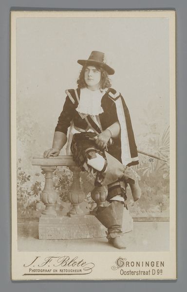 Curator: Here we have "Portrait of an Unknown Groningen Student in Masquerade Costume," a gelatin-silver print created sometime between 1886 and 1897 by Berend Mulder. The sepia tone lends it an air of nostalgia, doesn’t it? Editor: Indeed. It strikes me as playful, almost theatrical, but also quite formal. The masquerade costume seems meticulously constructed. The choice to pose beside that elaborate cabinet and the assortment of items arranged on the table speak to someone putting on a show, performing identity. Curator: Exactly. Think about the burgeoning photography industry then. Studios popping up, promising affordable portraits, changing the way identity was recorded and circulated. And the carte-de-visite format! Small, easily reproduced, and collected... This wasn’t just about having a portrait; it was about crafting an image. Editor: And I find myself wondering, who was this student, and what performances were they engaged in? It’s likely the masquerade connected with student societies, where one might have donned historical garb, embracing a moment of theatricality to blur and perform gender and class. Consider what adopting that identity did for this student at this precise historical moment. Curator: Let’s look at the materials. The tangible photographic paper, the chemicals, the studio props – even the fabric of the costume, likely sourced and assembled specifically for this event and photo-op – highlight the performative *making* of this image. We must appreciate how materials mediate meaning. Editor: Precisely! These sartorial and theatrical elements create a powerful narrative. The way historical garb connects with Dutch Golden Age paintings gives this photo-portrait an iconic character. Yet, beyond historical pastiche, it makes you think about who is excluded or underrepresented in these kinds of representations and how class, social power and sexuality are often masked or subverted through masquerade. Curator: Agreed, this single image gives insight into the intersection of social life, economics, and personal aspiration in a period of profound social change. I’m captivated by the studio’s material traces and how it informs this study in photographic portraiture. Editor: I concur! The photo, which is full of youthful ambition and a need to be seen in the public sphere, remains strikingly alive today as we reflect on it.