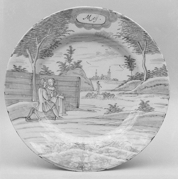 Curator: Let’s consider this plate, made between 1695 and 1730 by Pieter Adriaeusz Kocks and his widow. It's currently held at the Metropolitan Museum of Art. Editor: What strikes me first is how detailed it is. The composition has a dream-like quality and delicate precision with all of these botanical and figurative details and it is, in fact, an actual plate! How might we look at this piece, keeping its material reality in mind? Curator: Well, focusing on the materiality shifts our gaze from pure aesthetics to the processes involved. This ceramic piece isn't just an object of beauty. Think about the kaolin clay itself – where was it sourced? Was it local, or was it transported over vast distances, implicating colonial trade routes? The underglaze decoration, created with a limited palette, speaks volumes. Editor: That's fascinating, the global exchange aspect! How did those raw materials and decorative techniques move between cultures? Curator: Precisely. What about the labor required? The hand of the potter, the painter, the kiln worker – all contributing to its production. This "Plate," meant for dining or display, carries the marks of this collaborative production. Is it "high art" or simply functional ware? The boundary blurs when you consider the skill and artistry involved. The floral motifs and human figures could signal aspirations for a cultivated lifestyle, available through global commerce. It becomes a commodity embued with socio-economic meaning, reflecting cultural values through design and access. Editor: It really reframes how I see the object, beyond just something beautiful to admire. I realize it holds stories of trade and craft. Curator: Exactly! It urges us to think critically about the network of relations that gives rise to objects we often take for granted.