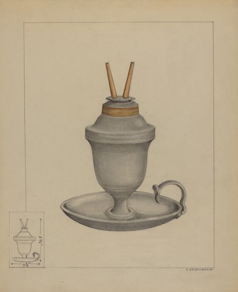 Curator: This meticulously rendered drawing is titled "Chamber Lamp" and dates back to around 1936. It’s a pencil work attributed to A. Zaidenberg. Editor: It has this haunting quietness about it. The cool grays, the precision—it’s almost spectral, like a memory of an object. It feels functional yet imbued with a subtle melancholy. Curator: Indeed. Zaidenberg's style aligns with an academic tradition, focusing on exactitude and a high degree of realism. You see a striving for objectivity in representation that mirrors the period’s emphasis on technical accuracy. Consider the rise of industrial design during this time. The humble chamber lamp becomes an object worthy of serious study, reflecting broader socio-economic values around production and function. Editor: Absolutely. The lighting's also interesting, right? Notice how flat the shadows are, as if illuminating the design but not adding warmth, more forensic than inviting, you know? I get a sense it isn’t just the object, but about documenting the very idea of “lamp.” Does that make sense? It lacks lived use. Curator: Perfectly. And if we position this piece within discourses around domesticity and labor, particularly during the Depression era, we can read the drawing not simply as a depiction but as an artifact laden with class anxieties. Consider that the glow of lamps and later electric light defined specific living and laboring patterns—both facilitated and limited by social standing. Editor: Mmm, that clinical, exact rendering really sets off what you say about its status. But back to the artwork: It is almost ghostly to look at, no glow or real material feel coming out, even though the forms themselves feel so very present, tangible somehow! It almost seems to represent that lost sense of 'making' instead. Curator: In the drawing’s understated style lies a significant cultural story, a tension between material worth and emotional resonance embodied in a very humble source. Thank you for bringing in those observations of your perspective! Editor: Yes, thanks—makes you see such art forms so differently; such an overlooked image holds such depth to uncover!