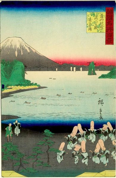 Curator: Let's discuss Utagawa Hiroshige's "THIRTY-SIX VIEWS OF FUJI =MIO-NO-MATSUBARA", residing here at the Harvard Art Museums. Editor: The serenity is striking! The composition, with the mountain's apex balanced by the shoreline, creates such a peaceful, almost meditative mood. Curator: Observe the layering—the solid blue of the water, leading to the patterned land and then the mountain. Notice the structural simplicity, the near-geometric forms. Editor: But it's more than just structure. Mt. Fuji looms large, often seen as a symbol of power and permanence, while the small boats suggest the lives and livelihoods dependent on the landscape. There's a push and pull. Curator: Indeed, that interplay of grand form and minute detail reveals Hiroshige's compositional mastery. It is so very balanced, isn't it? Editor: Balanced perhaps, but the view is also mediated, filtered through the artist's subjectivity and the socio-political currents shaping his vision. Curator: I see. While your contextual reading enriches my own visual analysis, I remain awed by the sheer formal elegance. Editor: And I appreciate how your insights underscore the artwork’s formal elements while prompting us to reflect on what is not immediately visible.