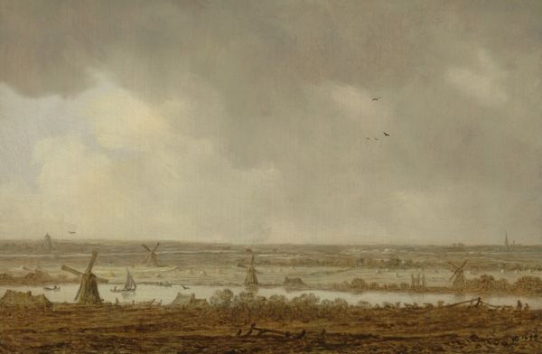 Jan van Goyen made this painting of a Dutch river scene on a wood panel, likely oak, using oil paints. The limited palette of muted greens, browns, and grays gives the work its character. It reflects the readily available pigments, as well as the artist’s aesthetic. The thin paint layers, applied with fluid brushstrokes, create a sense of atmospheric perspective. The materiality speaks to the economic realities of 17th-century Dutch painting, where artists often worked efficiently to meet market demands. Consider the labor involved in producing such a painting: from grinding pigments to preparing the wood panel, each step required skill and time. The subject of the work, a busy waterway dotted with boats and windmills, points to the centrality of trade and industry in the Dutch Golden Age. By paying attention to the materials, the making process, and the broader social context, we can gain a deeper understanding of this seemingly simple landscape painting.