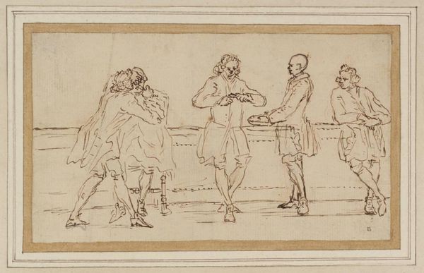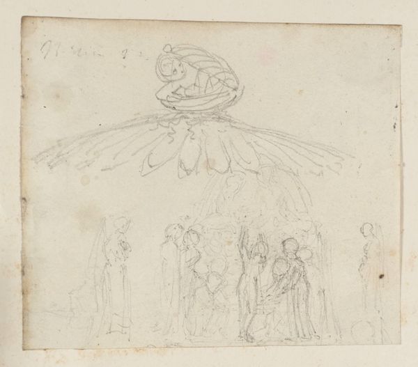 Editor: So, this is Thomas Stothard's "King John and Constance," a drawing held at the Tate. It feels very preliminary, almost like a quick sketch of a much larger, more dramatic scene. How do you interpret this work, especially given its unfinished quality? Curator: It's like catching a fleeting thought, isn't it? A whisper of Shakespeare on paper. Stothard, bless his heart, gives us the raw emotion—Constance's despair, John's…well, John’s being John. The sketchiness? It amplifies the instability, the raw nerve of the play. Notice how he positions the figures? It's a stage direction in itself. What strikes you most about Constance? Editor: Her posture, definitely. She's so hunched over, cradling her child. It speaks volumes about her vulnerability. Curator: Exactly! It's Stothard capturing that instant when power crumbles and all that’s left is primal emotion. Gives you chills, doesn't it? Even in its unfinished state, it's a powerful glimpse into the heart of the drama. Editor: It really does. Seeing the raw emotion laid bare makes the historical drama feel so relatable and personal.
