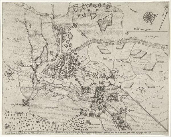 Abraham Dircksz. Santvoort’s etching from 1645, presents the siege of Hulst, dominated by the symbolic forms of military encampments and fortifications. These shapes carry deep historical weight. The star fortresses, such as the one surrounding Hulst, evolved from a need to withstand cannon fire, their angular bastions designed for defense. We see a similar impulse in the ancient ziggurats of Mesopotamia or even the layout of Roman camps—a primal need to protect and control space. Consider the swastika: initially a symbol of well-being and good fortune, it was later appropriated and distorted by the Nazi regime, becoming a symbol of terror. Likewise, the star fortresses represented here, while once symbols of security, also became emblems of conflict. The map then acts as a psychological landscape, reflecting our persistent drive to impose order on chaos, and the cyclical nature of defense and aggression.