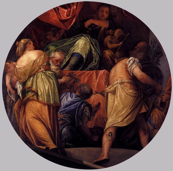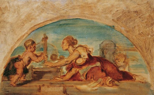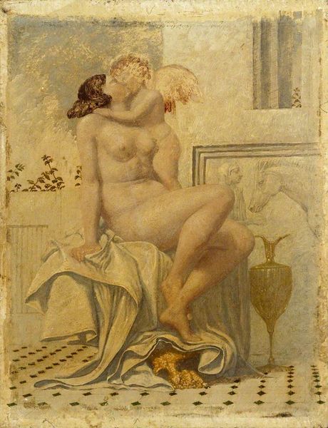 Curator: Immediately striking, isn’t it? There's a quiet intimacy to the piece that I wasn't expecting. Editor: Yes, an intimacy carefully crafted. What we’re looking at here is Zinaida Serebriakova’s "India," an oil painting dating from 1916. It's an example of early 20th-century Orientalism, revealing shifting perspectives in European art at that time. Curator: Orientalism indeed! I notice the heavy emphasis on the seated woman, the exotic other, resting comfortably. There is a touch of sensuality and languor, like she's posing for a secret pleasure. The woman's dark skin juxtaposes beautifully with her pearl jewelry. Her eyes are downcast, closed even; the face tilts, framed by white veil, with an orange fan as subtle decoration... Is she inviting or unapproachable? Editor: Precisely. And the way she’s positioned within the alcove; the almost architectural rigidity emphasizes the passivity often assigned to the East in Western imaginations. We need to consider how images like these contributed to a broader colonial narrative, right down to the cool blues of the alcove backdrop behind. It’s worth asking how complicit Serebriakova was in furthering such ideas or pushing against it. I notice how her work as a woman artist contributed a particularly rich history to this art movement. Curator: That interplay is precisely what makes this piece compelling. There's clearly a studied approach, but it doesn’t negate a visible vulnerability in how Serebriakova renders the human figure. Think of the use of round shapes, emphasizing wholeness. She captures, also, the cultural memory, perhaps of shared femininity, and all of that through the composition itself, not just the overt symbolism. Editor: Absolutely. I think approaching "India" demands an openness to nuance. Rather than dismissing it outright as solely perpetuating orientalist tropes, it invites us to critically consider how Serebriakova navigates—or perhaps inadvertently reinforces—complex power dynamics through visual representation and artistic license. Curator: So true. Viewing this piece allows us to reconsider some established views regarding art and society. The layers here encourage constant evaluation of image and purpose. Editor: Indeed. It’s a piece that prompts more questions than it answers, which, in my opinion, is a hallmark of truly engaging art.
