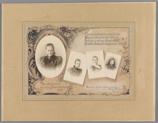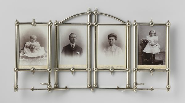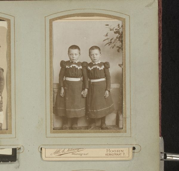 Editor: This is a photograph, possibly from 1903, by Fritz Wernicke, titled "Portret van Jessie, Tom, Dulcie en Willie" – an albumen print depicting four children. There's a certain formality to it, even a slight unease in their expressions, emphasized by the tight composition within the oval frame. What strikes you most about the form of this image? Curator: Primarily, I am drawn to the stark contrast achieved within the limited tonal range. Consider how Wernicke manipulates light to sculpt the forms, particularly in the children's faces. Note the subtle gradation from light to shadow, rendering a sense of depth, while simultaneously flattening the image plane. Do you observe the use of symmetry and balance within the arrangement? Editor: Yes, the two boys in darker attire flanking the two girls is hard to miss. But is this merely aesthetic? Are we meant to glean more meaning from this balance? Curator: The balance offers an ordered construction, yet the subtle variations – a slightly turned head, a differently angled gaze – prevent it from becoming rigidly symmetrical. The interplay between order and slight deviation creates visual interest, preventing stagnation within the composition. Moreover, examine the textures: the smoothness of the paper, the slight graininess of the photograph itself, these contribute to the overall sensory experience. Editor: I see. So, it’s not just about who is in the picture, but how the artist used light and arrangement to create a visually engaging composition, a conversation between symmetry and asymmetry. Curator: Precisely. Through careful observation and analysis of the formal elements, we can unlock a deeper understanding and appreciation of the work.