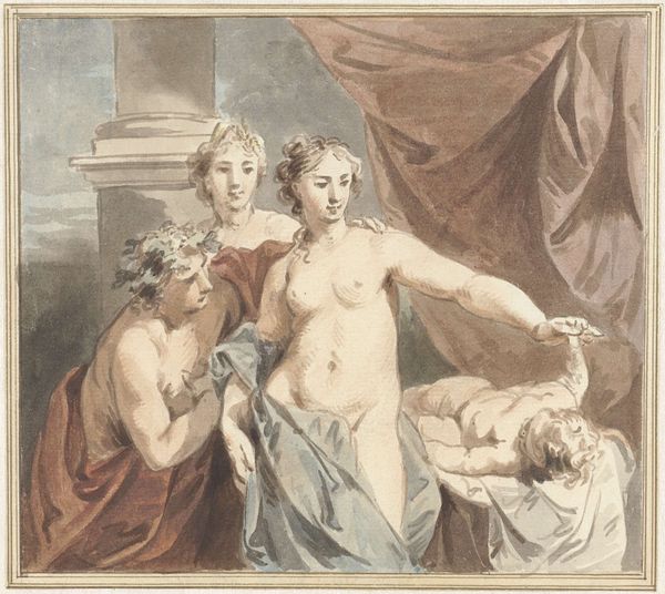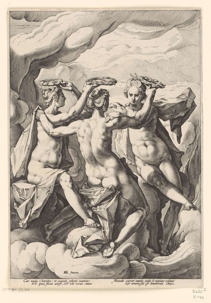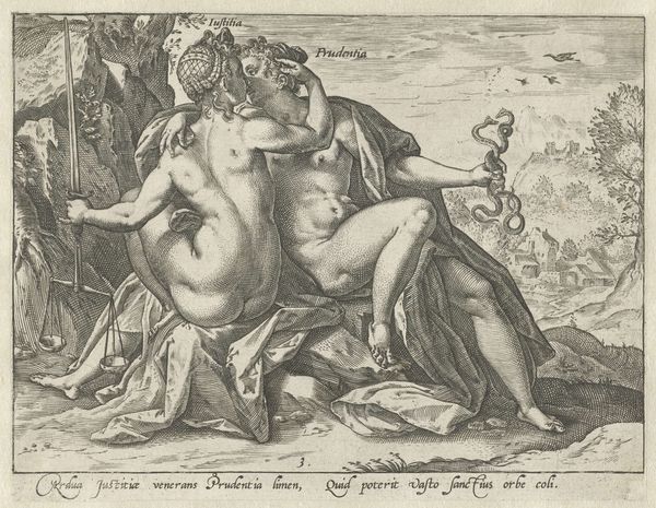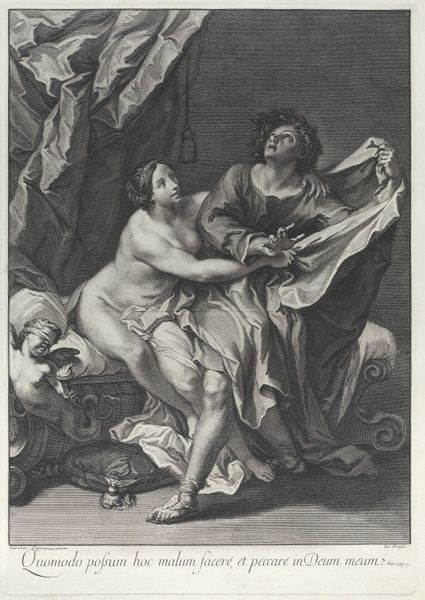 Cornelis Bloemaert made this print, “Jozef en de vrouw van Potifar,” sometime in the 17th century. It’s made using a technique called engraving, which is all about the skillful manipulation of metal. Think of the engraver as a kind of sculptor in reverse. Instead of building up the image, they carve away at a copper plate with a tool called a burin, creating grooves that will hold ink. The pressure of the hand, the angle of the tool - every tiny adjustment impacts the final result. You can see the precision in the fine lines that define the figures' bodies, and especially the swirling drapery. Engraving was an essential medium for disseminating images. This particular print tells a biblical story. But beyond that, it demonstrates the crucial role of skilled labor in image-making during this period. It was through this process that visual narratives gained wide circulation, influencing cultural values and aesthetic tastes. So, next time you look at an engraving, remember the artistry and labor involved in bringing these images to life, and its place in the broader social landscape.