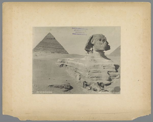 Curator: I'm struck by the desolate beauty of this photograph. There’s something inherently melancholic about it. Editor: That feeling is potent, especially knowing the image captures the Great Sphinx of Giza, and is attributed to C. & G. Zangaki, taken sometime between 1880 and 1900. What draws me in is this tension between its intended symbolic representation, contrasted with the imperialistic gaze. Curator: Absolutely, its setting amplifies that feeling! Note how the photographer chose to highlight the Sphinx amid its environment; it’s not just an isolated monument but embedded within a larger historical landscape. Editor: I agree. The composition is meticulously structured. I'm drawn to that solitary figure perched atop the Sphinx. On one level, the image underscores humanity's relationship with this monumental sculpture. But consider also the power dynamic: the human asserting dominion over an ancient symbol. Curator: The positioning definitely shapes how we consider this subject. The photograph not only documents the Sphinx but, subtly, our perception and perhaps even exploitation of the monument itself. Editor: And that gets to the heart of so much Orientalist photography of that time. Who is controlling the narrative, and what purpose does that narrative serve? We see the pyramids in the background as another potent symbol of cultural domination of Western photographers seeking to confirm Europe’s perceived place at the top of the world hierarchy. Curator: In my mind, what resonates is this tension between the image as a factual representation and the photograph as a medium that inevitably involves subjective interpretation. It's an uncanny fusion, a silent interplay. Editor: Very true, the image presents the ancient world to a modern audience while the pyramids exist as historical evidence and markers. It also prompts a broader investigation into historical, cultural, and even sociopolitical implications. Curator: Agreed, viewing images such as this certainly requires us to reflect on their layered meanings, recognizing them as relics of cultural fascination and sociopolitical agendas.