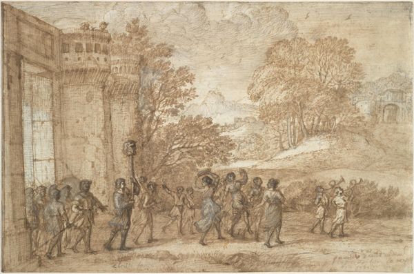 Hendrik Gerrit ten Cate created this watercolor drawing, "Village Festival at an Inn by the Dunes," using muted earth tones, primarily browns and grays. These shades construct a scene dominated by the natural and architectural elements of the Dutch countryside, lending the work a certain melancholic quality. Ten Cate masterfully arranges the composition into distinct zones. The inn, with its gathering of figures, anchors the left. This is juxtaposed against the open dunes on the right where the revelry spills out, creating a dynamic tension. The contrast in spatial arrangement directs the viewer's gaze across the scene, from the enclosed space of the inn to the vastness of the landscape, reflecting a visual dialogue between community and nature. The linear perspective, subtly employed, draws the eye towards a distant church spire. This creates a focal point that contrasts sharply with the immediate foreground action. In doing so, the spire acts as a structural element, subtly commenting on the relationship between the temporal festivities and enduring cultural institutions. This visual motif suggests broader themes of tradition and social structure inherent in Dutch genre painting.