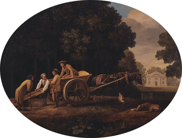 Curator: Look at the figures, casually arranged in a boat on a serene body of water. We are observing "A Party Angling" by George Morland. Editor: It strikes me as quite staged, almost like a tableau vivant. The contrast between the fashionable attire and the rustic setting is particularly intriguing. Curator: Indeed, the figures’ clothing contrasts sharply with the outdoor setting, underscoring the complex social dynamics at play. Consider how this image situates wealthy leisure activities in relationship to labour and power. There's the question of who is included in the 'party,' and who is perhaps serving it. Editor: I can’t help but wonder about the symbols. The act of fishing, often loaded with religious significance relating to abundance, or spiritual wealth. Does the reflection of the figures in the water carry a metaphorical message of self-reflection or perhaps a distorted sense of reality, a focus on wealth while those supporting are excluded? Curator: A keen observation. While the figures enjoy their leisure, are they oblivious to the labor that makes this scene possible? Their apparent disconnect reminds me of current conversations about wealth, privilege, and environmental exploitation. This resonates when we interpret through today's framework regarding the effects of our socio economic class upon ecological responsibility. Editor: Also, how water usually is seen, which in art functions as the subconsciousness: so a party engaging, dipping, is revealing here perhaps more unconscious behaviours? They’re penetrating and disturbing the still surface... Curator: Absolutely, and to expand upon your insightful commentary on the distortion of the surface tension and reality; notice too that the lack of strong perspective gives it a feeling of an altered space. Editor: This gives a kind of disquieting, surrealistic feel to the otherwise tranquil image. Makes one think further beyond that placid party scene and that world. I shall never look at leisurely angling the same way again, truly. Curator: Well, considering the themes it invites us to investigate—the ethics of wealth and labour and what is actually below a tranquil, and wealthy facade, it makes me appreciate the many complex meanings the painting has.