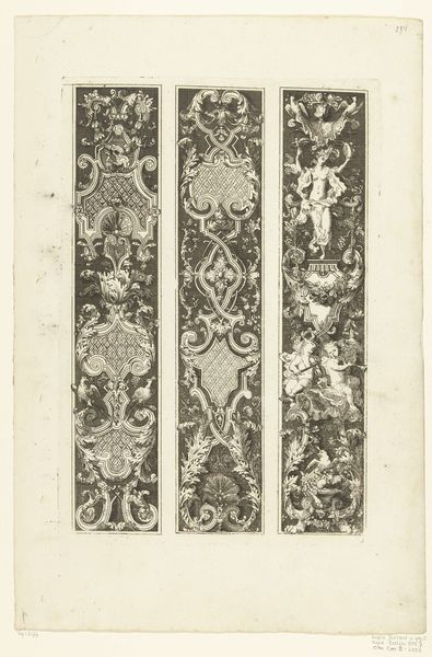 This etching by Daniel Hopfer presents a design for armor decoration, showcasing the intricate craftsmanship of the late 15th or early 16th century. The artwork is defined by three vertical panels, each filled with detailed floral and foliate motifs. These decorative elements ascend from stylized vases, drawing the eye upward with their delicate forms. Hopfer masterfully uses the etching technique to create depth and texture. Note the contrast between the densely patterned backgrounds and the lighter, highlighted areas of the floral designs. The composition follows a structured, almost architectural rhythm, which would have complemented the rigid form of the armor it was intended to adorn. The symmetry and repetition of the patterns reflect a broader cultural interest in order and balance during the Renaissance. However, the slight variations within each panel also suggest a move towards individual expression and artistic freedom. This blend of structure and variation invites us to consider how Hopfer challenged the boundaries between decorative art and individual artistic vision.