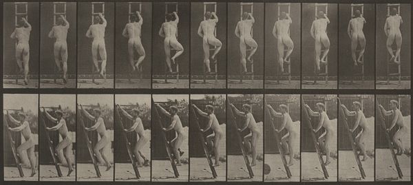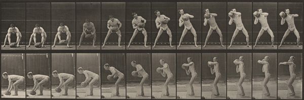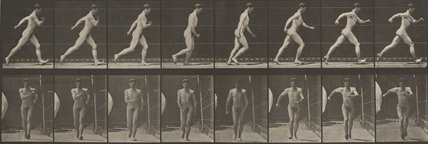 Curator: We're looking at Eadweard Muybridge's "Plate Number 68. Running," a photograph from 1887. Editor: The subject appears frozen in time, like a figure trapped in amber. There is an echoic cadence to the figure, rendered sequentially in different stages of his run. Curator: The photograph presents a series of individual images that break down the act of running into discrete phases. Muybridge aimed to analyze and capture motion scientifically. What do you read into this rendering, beyond science? Editor: There’s something heroic about it, though clinical, despite the photographic process and rationalist composition. The linear nature of the arrangement also conveys progress, the notion of perpetual and forward movement, but it may be aspirational, in that, in our earthly state, nothing lasts forever. The use of grayscale underscores this elegiac interpretation for me. Curator: Yes, and consider what running symbolizes—the race of life, perhaps, the continuous striving and our culture’s focus on progress and athleticism? Muybridge wasn't just recording; he was contributing to a new visual language and scientific method. Editor: True. Muybridge gives form to our lived experiences of space and temporality through the logic of mechanical reproduction. Yet, within these seemingly rigid forms, the very potential of the photographic print is revealed. Curator: Muybridge reveals how closely intertwined technology and ideology had become by the end of the nineteenth century. Photography both reveals and informs what we know and believe about ourselves, down to even our movement in space. Editor: Seeing the breakdown of a man’s stride evokes introspection on temporality, progress, and the elusive and somewhat sorrowful qualities of continuous and irreversible change. Curator: Indeed. These seemingly objective records resonate profoundly with us even today. Editor: His attempt to distill running into stages—in itself, an analysis of continuous change into a still-life.