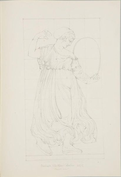 Curator: This is Kenneth John Conant's "Fortune, after the antique," currently held at the Harvard Art Museums. Editor: My first impression is of a delicate, almost ghostly figure. The linear quality and the grid immediately behind it feel incredibly precise. Curator: Indeed. Observe how Conant uses the grid to structure the figure's pose and drapery. It's a clear application of classical principles of proportion and ideal form. Editor: It also speaks to a technical drawing exercise, a study in how to translate the form of the antique. I wonder what kind of paper and pencils the artist used to create this effect? Curator: A pertinent question, reflecting the work's materiality. The drawing's subtle lines create a sense of poised equilibrium and the implied movement of Fortune atop her sphere. Editor: So, it’s a material record and conceptual study that balances artistic ideals and the artist's practice. Curator: Precisely. This layered image reveals much about the interconnectedness of artistic skill, tools, and philosophical ideals.
