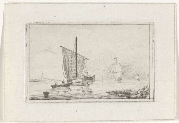 This is a print titled 'Zeegezicht met zeilschepen' (Seascape with sailing ships) by Willem Gruyter jr. The etching shows a calm scene on the water. It suggests the Netherlands of the 19th century, a nation deeply connected to the sea. Water transport was crucial for trade and communication, and maritime scenes like this were popular. Here, the image shows us not grand naval battles, but ordinary working vessels. The print also has a relationship to the art world. Etchings like this one were often made as reproductions of paintings, allowing the circulation of images to a wider public. This print, held in the collection of the Rijksmuseum, connects to the institutional history of art collecting and display. Understanding this work requires considering the social, economic, and artistic conditions of the time. Art history helps us to see these connections, drawing on a range of sources to interpret the work in its full context.