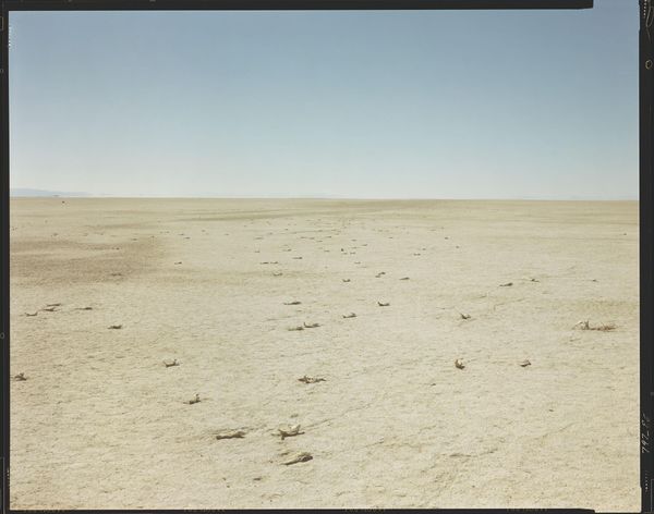 Editor: Here we have Richard Misrach's "San Jacinto Mountains Sequence" from 1985. The photograph evokes a quiet, almost melancholic feeling, don't you think? The beige of the foreground blends subtly with the mountains in the distance under a soft blue sky. What strikes you most about this image? Curator: Oh, that melancholic observation resonates deeply! It whispers stories, doesn't it? For me, it's about that liminal space – the edge between the human touch and the raw, indifferent majesty of the desert. Look closely, do you notice the slight disturbances in the sand? Are those tire tracks? Small attempts at taming the wild…a futile endeavor perhaps, like trying to capture the ocean in a bottle. Editor: Yes! I see them now, almost faded. So you're saying that it shows our attempt to coexist with nature? Curator: Coexist…or perhaps just leave our mark. Misrach often grapples with this tension in his work. I see it as a quiet warning about the ephemeral nature of our presence. The mountains, stoic and eternal, watch our fleeting dramas play out. And, between us, there is something beautiful, maybe even poetic, in that realization, don't you agree? Editor: I think so. I hadn’t initially considered the marks as a disruption. I’m now reconsidering the scale of nature's indifference and impact of our presence. Curator: Precisely. That shift in perspective, that's the real magic of art. What seems simple on the surface can unveil layers of profound meaning, if we only allow ourselves to truly *see*. Editor: Thanks, I learned a lot today about seeing between the obvious. Curator: My pleasure entirely, such rewarding visual expedition.