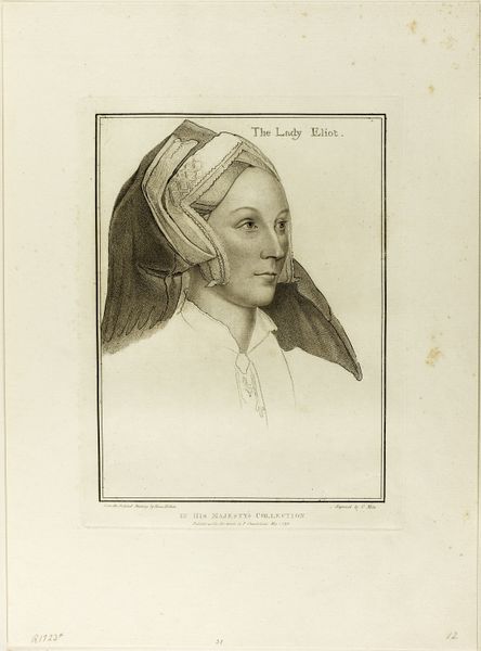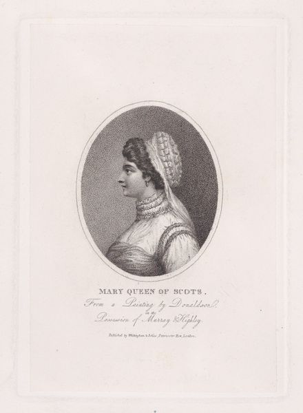 Editor: So, this is a lithograph from 1836 by William Holl the Younger, titled *Mary, Queen of Scots.* The soft lines of the print give her such a vulnerable appearance, even delicate. What do you make of it? Curator: The vulnerability you perceive is quite striking. The image certainly invites reflection on the layers of meaning accumulated around Mary’s persona. Consider the headdress; it's both modest and regal, isn't it? A signifier of piety and constraint, yet also of status and lineage. Do you see a conflict there? Editor: I do. It feels like a visual representation of the conflict in her life– between her duty and her desires, maybe? Curator: Exactly! The portrait operates on multiple levels. Holl uses familiar tropes of Romanticism – the pensive gaze, the subtle chiaroscuro – to tap into the cultural memory of Mary as a tragic figure, burdened by destiny. The simplicity emphasizes the emotional and psychological weight she carries. Consider too, the gaze she offers us… what do you discern in it? Editor: It feels almost accusatory, maybe even pleading. As if she's silently asking us to understand. Curator: Precisely! The artist employs these visual symbols, almost archetypes, to speak to universal themes: power, betrayal, sacrifice. The lithograph, as a readily reproducible image, democratized that narrative. Editor: That's fascinating – I never considered how the printmaking technique would influence its meaning. It really puts her story into the hands of the public. Curator: Indeed! This piece is a powerful example of how images serve as cultural touchstones, carrying forward history. Editor: Thanks, that's given me a whole new appreciation for this image, how the romantic style and printing technology amplify its cultural and historical implications!