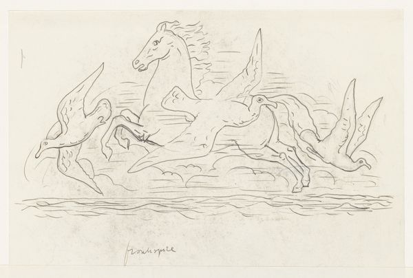 Editor: Here we have Leo Gestel’s "Three Birds in the Sky Above the Sea," created sometime between 1891 and 1941. It's an ink drawing, with such stark lines. It feels very immediate, almost like a sketch from a field journal. What do you see when you look at it? Curator: I'm drawn to the simplicity of the materials. Ink, paper, the tools easily available, almost cheap. What elevates it from just a sketch is the modernist sensibility. Think about the conditions in which an artist creates work; not always lavish studios but also moments captured on paper or canvas because it is ready to hand. Are they challenging traditional oil paints as high art and the drawing as disposable sketch? The act of making becomes the focus here, pushing back against established art markets and norms. Editor: I never thought of it that way. It’s true; anyone could pick up ink and paper. How does that relate to the subject matter of birds? Curator: Consider birds – universally available but intensely surveilled, tracked. Gestel makes three outlines on the sky, making them available as an owned image. But does owning an image of an artwork owned change our relation to the natural subjects or the political context? I mean who exactly profits from us owning these birds in print? The viewer gains the freedom, from the original purchaser. Gestel’s ink isn’t so free, is it? Editor: So you’re saying the very accessibility of the drawing actually brings up questions about control and ownership, and the art market that facilitates that? Curator: Precisely. This simple ink drawing throws open questions on artistic labor and consumerism. Even in modernism there were different grades and hierarchies! Editor: I’ll never look at a simple drawing the same way again. I am surprised how loaded what seems so simple can actually be. Thanks!