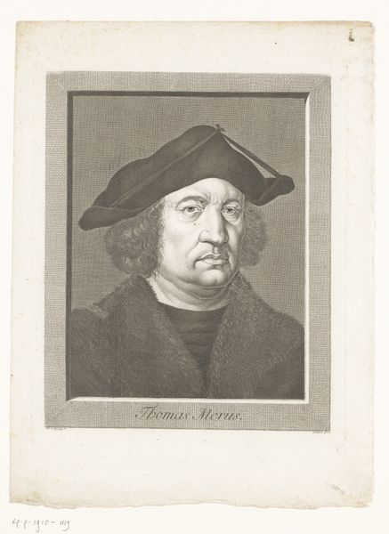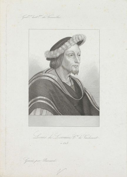 Curator: Francesco Bartolozzi, working around 1792, captured "Sir Henry Guildeford" in a graphite engraving, now residing here at The Art Institute of Chicago. Editor: Immediately I’m struck by its intimacy. It's a whisper of a portrait, the lines so delicate it feels like a fleeting thought given form. Almost like a ghost captured in paper. Curator: It's fascinating to consider the context. Bartolozzi was instrumental in popularizing the stipple engraving technique in England, becoming engraver to the King. This print then, takes on a public dimension. Editor: It does feel very…official, somehow. That careful inscription at the bottom: "In His Majesty's Collection." It's like this Guildeford fella isn’t just some bloke, he’s been vetted and approved for royal consumption! The pencil sketches remind me, a bit of, caricature portraits I saw in Rome. Curator: Well, the original drawing for this engraving was done by Hans Holbein. Bartolozzi reinterpreted that work for wider circulation. That makes it part of a bigger discussion around access to imagery and power. Royal image-making was essential to establish and reaffirm hierarchy in a moment of considerable European unrest. Editor: See, I look at that half-finished cloak, all those tentative lines, and I think, “This is a man in progress." Like the portrait, I guess, a rendering with possibilities of how we consider what an upstanding English figure should even embody. Does he look melancholy to you? Or is he determined to do the right thing. It's all there isn't it! I love his face. Curator: That sense of potential resonates with the Northern Renaissance ethos. Holbein, and subsequently Bartolozzi were tasked with conveying status, the sitter's participation within a sophisticated political framework and the circulation of visual representation of power. The unfinished sections of this print do highlight how the circulation of images were not as clearly defined then as now, especially for "high" figures. Editor: I like how those two perspectives jostle here: The weight of history, and this…unfinished potential. He's got weight on his shoulders, he's probably committed questionable choices. But he doesn't look corrupt, merely...human. It makes me feel quite curious, if not sympathetic to this figure! Curator: Indeed. The piece shows us not only what was considered politically necessary during a specific historical era but, it gives us an insight into the figure's evolving characterization and the nature of authority itself.