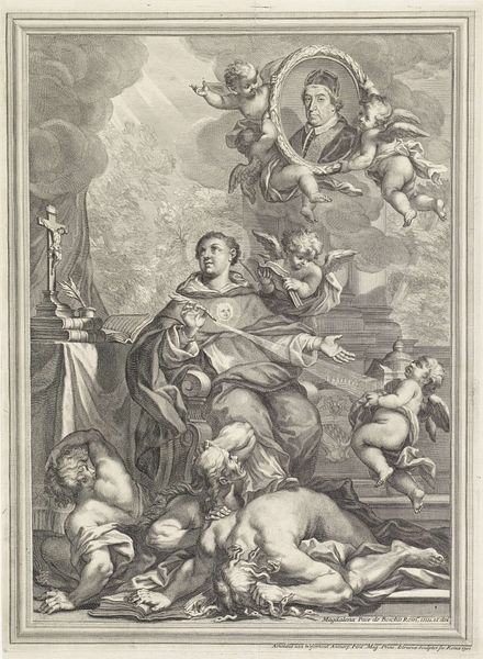 Curator: Gėrard Edelinck’s engraving, titled “Allegory of the Arts,” completed somewhere between 1666 and 1707, offers a glimpse into the artistic values of its time. Editor: My immediate impression is that this is airy, full of lightness, literally and figuratively. The billowing clouds and cherubic figures create a sense of heavenly inspiration. It's also, well, classically ornate, like looking into a Rococo dream, but in black and white. Curator: Absolutely. The composition is deliberately arranged. The central figure, a personification of the arts, sits atop clouds with instruments and symbols of various art forms surrounding her. Note how the cherubs are actively engaged in painting, sculpting, and music-making. These cherubic figures are really vehicles of classical symbols in their embrace of various creative media. They really reinforce a sense of tradition and inheritance. Editor: It is fascinating to see these cherubs enacting production! Given the historical context, I wonder about the status of these craft activities. Is Edelinck making a statement by featuring this image of children actively working at creative practices as signifiers of these art forms? Curator: It is intriguing. In allegorical representations, details such as their activity elevate what might otherwise be considered mere crafts into divine inspiration. Look at the inclusion of the obelisk, adorned with symbolic images. Editor: I am equally drawn to how the etching captures the different textures--from the solidity of the obelisk, to the softness of the clouds, to the sharp details in the musical instruments. There's real material richness achieved through relatively simple means of production. Curator: I concur. The limited contrast amplifies its enigmatic quality, drawing us in to unravel its symbolic layers. What might be deemed old-fashioned may have a timeless visual language to beholders today. Editor: The layering of visual materials, literally and figuratively, allows this work to function both as document and dream space, revealing the means by which we memorialize processes that capture moments in time.