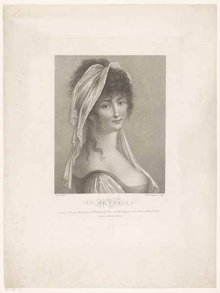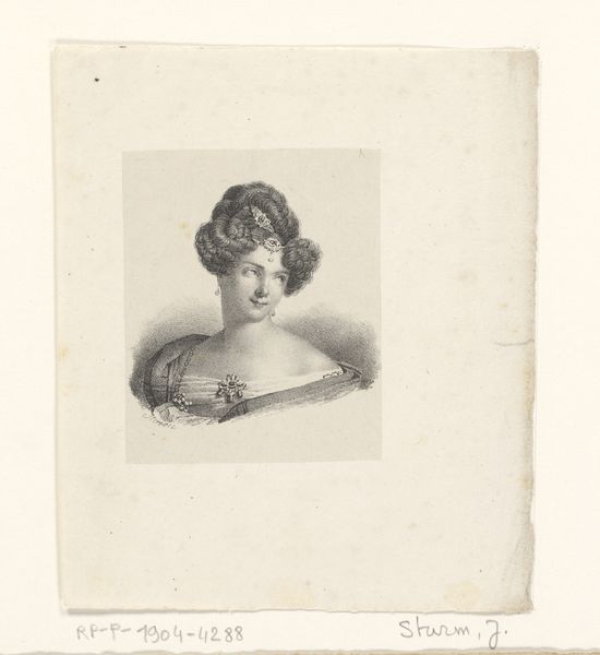 Editor: This is a portrait of Maria Carolina of Bourbon-Sicilies, rendered in 1829 by Zéphirin Belliard, using pencil and engraving. The piece has this delicate, almost ethereal feel. What do you make of it? Curator: Oh, she’s luminous, isn't she? There’s something wonderfully romantic about it, all those wispy feathers and soft shading, that hint at a bygone era of powdered wigs and hushed secrets. Have you noticed how Belliard manages to convey her social standing not through grand jewels, but through the meticulous detail in her attire, that conveys a story without shouting? It’s not just likeness, is it? Editor: Definitely, the subtle details contribute a lot. The slightly smug smile, perhaps? Curator: Indeed! It hints at an intelligence, a sly understanding, or perhaps a quiet confidence that belies the rigid conventions of the time. The way the light dances on the fabric almost makes me feel like I'm eavesdropping on a private moment. A quick glimpse of the personal behind the posed… don't you think? Editor: I hadn’t thought about it that way. It's amazing how a simple pencil drawing can reveal so much. Curator: Exactly! It reminds us that even portraits meant to project power or beauty, inevitably offer us fragments of a life, impressions that endure through time, like whispers across a crowded ballroom floor. Editor: I love that, whispers across a ballroom floor. Thanks for helping me see so much more in this portrait. Curator: The pleasure's all mine. Every artwork holds a universe within if you only let it speak.