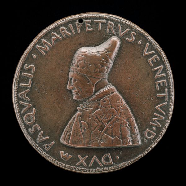 Curator: Here we have a bronze medal dating back to around 1457, created in the Italian Renaissance style by Antonio Gambello, featuring a profile portrait of Francesco Foscari, who was the Doge of Venice from 1423. Editor: My immediate thought is solemn. The low relief combined with the patina of the bronze gives a profound sense of gravity and timelessness to the Doge's image. Curator: It is fascinating to consider the social implications of creating portraits in medal form during this period. These weren’t large-scale public monuments but smaller objects, made accessible to a certain class—powerful elites reflecting on status and legacy. How do you see it reflecting, or shaping, political messaging at the time? Editor: Medals like this played a critical role in shaping the public image and consolidating power for the elites and figures they represent. It allowed rulers to control how they were seen and remembered, similar to today's political advertisements. Curator: I'm drawn to the detail that went into the making of this medal. The artist must have employed a very skillful method of casting bronze for it. The sharpness of the inscribed letters, consider that labor against the preciousness of bronze, and the time invested. The texture achieved adds to its tactile quality; its material presence makes it even more compelling. Editor: Absolutely, these weren't mass produced trinkets. It says something about Foscari’s ambitions as Doge that he used artistic productions to project an air of classical dignity and the enduring power of Venice. Curator: The circulation of medals like these really speaks to the rise of powerful figures needing self-validation in visual and material form during the renaissance. Looking closely allows us a small peak into understanding complex and power-fueled societies of the past. Editor: Indeed, looking at it in this light shows how art can become a tangible reminder of socio-political intentions from centuries ago, offering unique insights into powerful cultural moments and personalities.