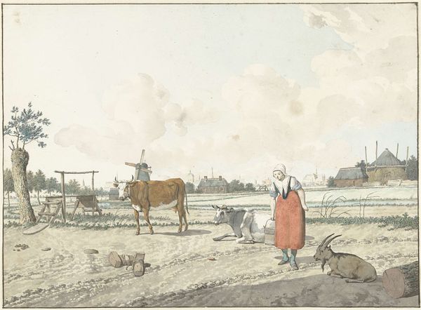 J. Dirksen's watercolor depicts a pastoral scene, likely from the late 18th or early 19th century, offering a glimpse into the Dutch countryside. The windmills and grazing cows are a familiar scene, yet the presence of the figures invites a deeper look into the social dynamics at play. The depiction of rural life often romanticizes the labor involved. Here, the figures appear small, their lives intertwined with the rhythms of nature and the demands of agricultural life. The presence of windmills in the background also point towards the region’s reliance on wind power for tasks such as draining land and grinding grain, which were vital to the Dutch economy. Consider how the artist, through their choice of subject matter and composition, shapes our understanding of the relationship between humans, labor, and the land. Does it celebrate a harmonious coexistence, or does it hint at the underlying tensions and power dynamics inherent in this rural setting? It is interesting to reflect on how such images contributed to constructing national identity and ideals.