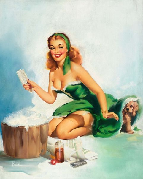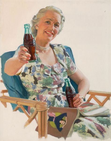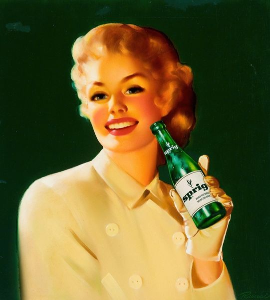 Edward Runci made this calendar ad for Nesbitt’s, probably sometime in the middle of the 20th century, and it’s a masterclass in smooth, seductive illustration. It’s all about curves and a limited colour range, mainly oranges and blues. Looking at the woman’s face, her bright red lips and rosy cheeks, there’s not a single visible brushstroke! How did he do that? It’s so different from my own slapdash technique. The way Runci’s controlled blending creates a near-photorealistic effect makes me think of the way Gerhard Richter makes his abstract paintings. But what really gets me is the flag in the background – its simple blue shape mirrors the bottle in the woman’s hand. Does it represent a sports team, or something else? Is it a reference to something else entirely? That ambiguity is what keeps me coming back.
