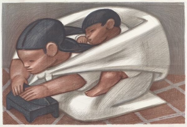 John Wilson created this lithograph, titled "Campesinos", sometime in the 20th century. The image, rendered in shades of grey, depicts a family of three. The composition is structured around a central triangular form, drawing our eyes to the bowed heads and clasped hands, infusing the scene with a mood of solemnity and introspection. Wilson masterfully uses light and shadow to sculpt the figures, giving them a sculptural presence. The woman and child are positioned to the right, anchoring the composition, while the man on the left holds a hat that serves as a poignant symbol of labor and perhaps, lost hope. The stark geometric buildings in the background provide a sharp contrast to the soft curves of the figures, highlighting their plight against a rigid, unyielding world. Wilson's print evokes the formalist concept of "significant form," where the arrangement of shapes, lines, and tones generates an emotional response, inviting us to contemplate the dignity and resilience of the human spirit amidst adversity.