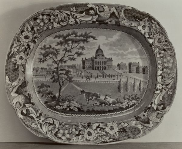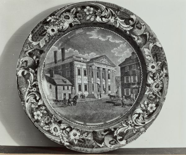 Curator: Helmut Hiatt's plate, "Octagon Church, Boston," created around 1936, offers a fascinating glimpse into American decorative arts of the period. Editor: My first thought? There's a deliberate tension here. The crisp lines of the architecture set against the softer, almost romantic floral border feels very purposeful. It immediately sparks questions about audience, about use. Curator: Exactly! The very medium is worth noting – it elevates an everyday object by incorporating iconic architectural imagery, in this case a specific Boston church. Given the time it was made, and the presence of the decorative flowers it is evocative of mass-produced items affordable across economic strata and for middle class families. The print, which has the affect of charcoal art, placed on the dish blurs the lines between mass culture and high art. It asks: who does the decorative arts serve, who benefits and what does this mean in a Depression era USA? Editor: The materiality absolutely underscores that. It's not just about visual representation, but about consumption, accessibility, the physical act of using and interacting with art in the home. One wonders the type of labor to create this plate. What does its creation indicate? It speaks to larger structures and processes involved in its manufacturing and distribution, even more when one thinks of how the final buyer's perspective of luxury changes given it mass creation! Curator: That’s a compelling interpretation. It reframes how we engage with architectural depictions, suggesting they weren’t just passive representations of buildings or places, but symbols embedded within complex social and economic relationships. It speaks to an ever present discussion on race and the making of American artistic production. Editor: I agree. Hiatt asks us to rethink what it means to value and display architecture, connecting it directly to our everyday lives through these consumer goods. Curator: This challenges us to look beyond surface aesthetics and grapple with the multifaceted roles objects play in shaping our perceptions and power structures. Editor: Right. Analyzing “Octagon Church, Boston” in that framework unveils the social forces at play in defining what art can be and for whom it exists. The octagonal shape provides an intersection of multiple lines that converge. Who builds? Who profits? who is served? Curator: So, the next time you look at decorative art of the 30s, consider it within this intricate dance between creation, representation, and societal constructs. Editor: Precisely. What appears simple on the surface invites us to ask difficult questions. That's the mark of successful, and useful, art.