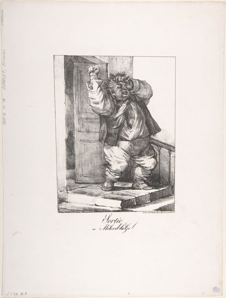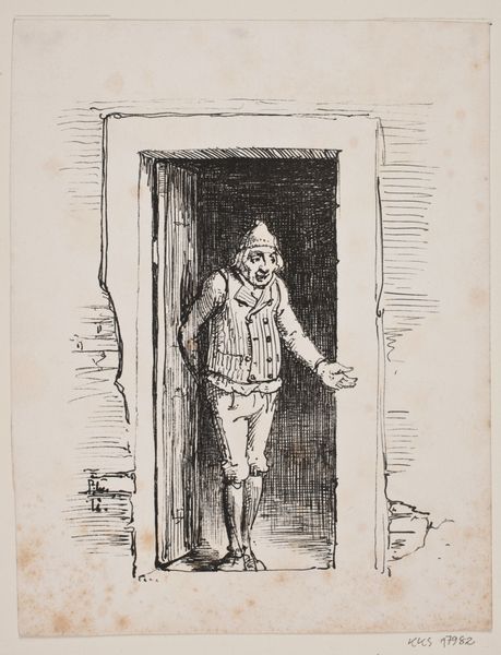 Editor: Here we have "Man die door deur komt en hoed afneemt," which roughly translates to "Man coming through the door and taking off his hat". It's an engraving from between 1700 and 1730, its author sadly anonymous, and held at the Rijksmuseum. It’s such a simple scene, but there’s something almost theatrical about the gesture. What do you see in this piece? Curator: The simple act of removing one’s hat is rich with symbolic meaning, isn't it? It's an unveiling, a revealing of the self. Think about the door – it is a potent symbol of transition. Is he entering a new phase, leaving something behind? The hat itself speaks volumes about status, and propriety. Do you think that this single gesture, is of respect? Editor: Absolutely! The way he’s holding it almost feels performative. It does make you wonder what he’s walking into. Curator: The slight bow of his head coupled with removing headwear also represents an acknowledgement of something. In the baroque style, everything had a message. But I think, that message still resonates today – consider the power we attribute to someone baring their head, as a token of trust. Do we view that trust with some skepticism? Editor: That's such an interesting point. Maybe there’s a degree of vulnerability there that makes us cautious? And now seeing it again, is that wariness there in his gesture? He almost peers with apprehension, with his cap being held out as if on offer... Curator: Exactly! Visual languages persist. From classical art, the meaning behind things continues to echo. Our response, as much as the engraving itself, says something about our culture doesn’t it? Editor: It does! Thank you. It's amazing how much meaning is packed into one simple act. I will consider it every time I see someone taking their hat off. Curator: An act that continues to evolve within the performance of living itself!