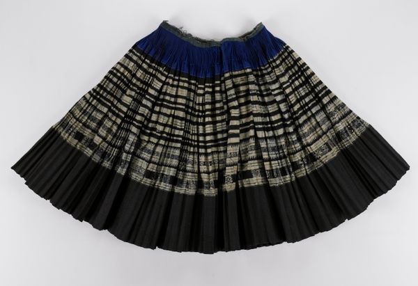 Curator: Welcome. We're looking at a White Miao Pleated Skirt, likely crafted sometime in the 20th century. It resides here at the Minneapolis Institute of Art. Editor: Well, hello there! It's much smaller than I expected, isn't it? Almost a miniature, but the color—that deep, almost bruised indigo—is utterly captivating. The folds ripple like shadows... Makes me think of mountains and secrets. Curator: The "secrets" lie in its making. Consider the intensive labor required for that pleating, the dying of the cotton. These skirts aren't mere garments; they are a concentrated form of material production, of female labor, and of cultural identity. Editor: Absolutely, you feel that labor radiating out. It's funny, but I imagine the woman who made this pouring stories and songs into the very fabric, layer by layer... Kind of like my own process when I write. Is that mad? Curator: Not at all! Think of the cultivation of cotton, its transformation through spinning, weaving, dyeing... Each step rooted in specific skills, tools, social customs, even markets. This skirt connects us to entire systems. Editor: True. And beyond mere commerce or materials, it hints at rituals and perhaps even dances...I get a festive impression from those decorative horizontal panels! They must light up when she twirls... Is there symbolism buried in them, do you know? Curator: Certainly, motifs carry symbolic weight in Miao textiles. The horizontal patterns act as registers of visual narrative. Think of these elements as threads interwoven not only with cotton but also with meaning. Editor: Lovely! Now, standing before it, my immediate impulse is touch... Do you think it remembers the touch of the maker or its wearer? The places it’s been, the gatherings? Oh, that melancholy indigo—I can feel entire seasons pulsing within! Curator: What resonates is that this object connects individuals across space and time. A legacy materialized—testimony to production practices, cultural expression, and a garment's unique biography as a thing made and used. Editor: So it is! A powerful echo in blue… thanks to how closely you examined both its visible design and cultural context. It has woven its little spell on me!
