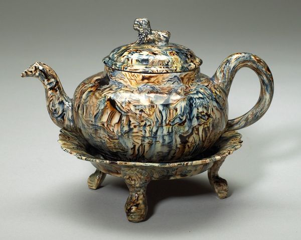 Curator: Here we have a stunning silver teapot crafted between 1743 and 1744 by Paul de Lamerie. You can find this piece, an exemplar of the Baroque style, here at the Metropolitan Museum of Art. Editor: My word, what a flourish! It's absolutely teeming with tiny scenes. Feels like stumbling upon a hidden world, but, you know, on a teapot. Very Downton Abbey by way of a fairy tale. Curator: It is intricate, isn't it? Note how the silver work narrates miniature scenes—perhaps allegorical—revealing an era steeped in classical revival. Notice the figure near the spout: a muscular laborer amongst lush, engraved foliage. The dragon-headed spout is quite striking, suggesting power and exoticism. Editor: Absolutely. The dragon practically roars "tea time!" But it's that wooden handle that intrigues me, providing a warm contrast to all that gleaming silver. There's such a deliberate mix of the organic and ornate; I find it comforting, in a delightfully excessive way. Curator: That's an astute observation. The wooden handle brings an element of practicality to this otherwise highly decorative piece. These objects were meant for use, reflecting not just status, but a cultivated domestic sphere. How do you interpret that juxtaposition? Editor: It’s as if Lamerie is grounding the sheer fantasy of it all with something solid and familiar. You've got mythology battling for space with…well, tea! There’s something wonderfully absurd, and inherently human, about that tension. It's like art history meets tea leaf readings, wouldn't you agree? Curator: Perhaps a dance between tangible wealth and intangible cultural meaning. This teapot speaks volumes about its historical context—the rise of mercantile power, global trade, and the significance of tea in aristocratic society. Every curve and creature on its surface adds to the narrative. Editor: It's tempting to imagine the hands that held it, the conversations that brewed around it, and the small dramas that unfolded with each cup poured. Thanks to its many details, this beautiful piece encourages you to daydream. Curator: Indeed. An ornate container, holding more than just tea. Editor: Absolutely. More like a silver time capsule.