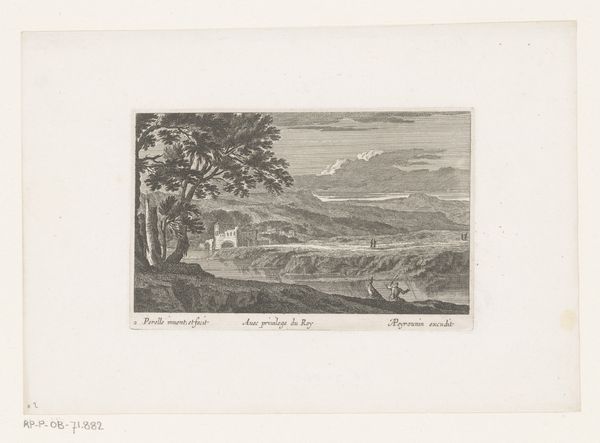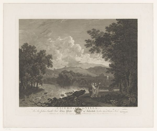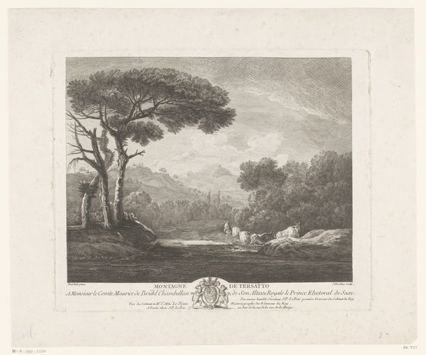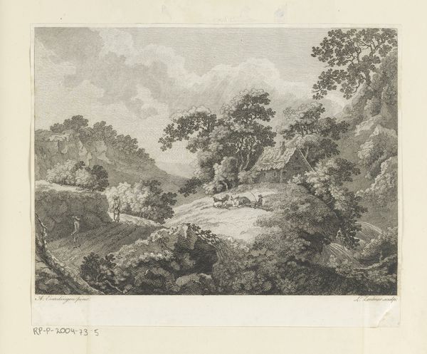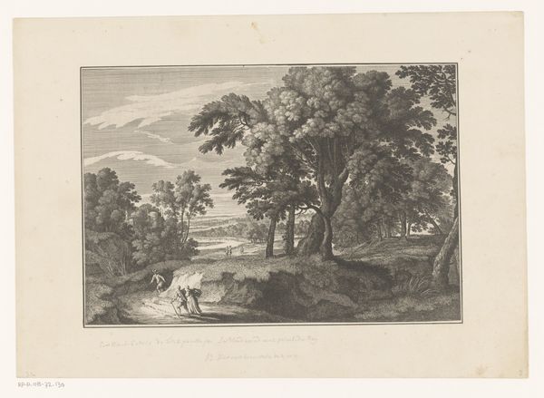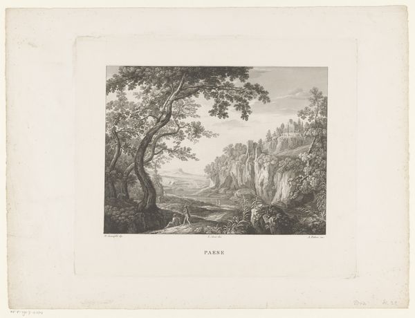 Editor: So, here we have "View of Schlangenbad," an engraving on paper by Ludwig Friedrich Schnell, created sometime between 1810 and 1845. There's something so appealing about these old prints. It feels peaceful and serene, almost a little melancholy. What catches your eye about this piece? Curator: That's a wonderful initial feeling! The serenity speaks volumes, doesn’t it? I’m immediately drawn to the almost theatrical framing with those trees. They feel like curtains, opening to a stage where nature performs. Notice how the perspective guides our eye – almost too perfectly – back towards the buildings nestled in the valley. Do you get a sense of Romanticism peeking through? Editor: Absolutely! The landscape feels idealized. The figures seem small compared to the grand scene. I can see how that evokes a sense of awe and maybe even the sublime. Curator: Exactly! Schnell uses the landscape not just as a backdrop, but as a character. The tiny figures underscore the power of nature, but there's also this undercurrent of...loneliness? Perhaps a bit sentimental? And think about the medium. The meticulous engraving reinforces that desire for order and control amidst the wildness. I wonder what stories those buildings could tell if we looked closer? It's almost like peeking into a bygone era. Editor: It's making me rethink landscape art! It's not just about pretty scenery but conveying a specific emotion. Thanks! Curator: Precisely. And the more we linger, the more layers unfold, wouldn’t you agree? Every detail holds a whisper of a story; art’s clever way of staying in our hearts!