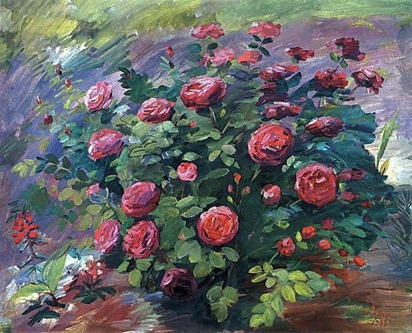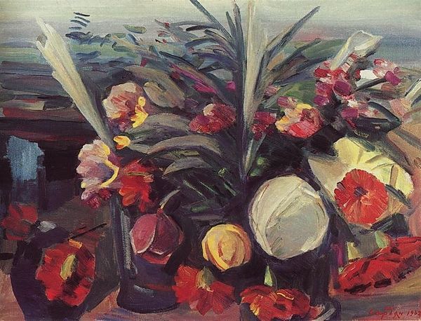 Editor: Here we have Martiros Sarian's "Roses," painted in 1949. It’s an oil painting, a vibrant still life. The way the thick paint is applied gives it such a tangible feel. What strikes you about it? Curator: Look at the density of the paint itself. Sarian wasn't just depicting roses; he was engaging with the very *stuff* of paint. Consider the context of 1949. Post-war, resources were often scarce. Was Sarian perhaps commenting on luxury versus necessity, using a traditionally 'feminine' subject like flowers? Editor: That’s a really interesting point I never considered. So, you're suggesting that the choice of such a thick application of paint could have symbolic weight? Curator: Absolutely. Think about the labor involved. The visible brushstrokes, the sheer volume of oil paint used when others might have been rationing… it all contributes to a statement. How accessible would these materials have been to the average artist, and what does that say about artistic privilege, even in the Soviet context? Editor: So, it is a sign of artistic privilage as the war just ended a few years earlier, as resources for regular people would be hard to obtain, while Sarian was making art from them? Curator: Exactly. Consider who had access to the means of production - paint, canvas, studio space - and what kinds of stories those material conditions allow them to tell. This isn't just about the beautiful flowers; it's about the power dynamics embedded in artistic creation. How does that perspective change how you see the artwork? Editor: It adds a whole new layer. I was initially drawn to the beauty, but now I see it's also a product of a specific time and set of social circumstances related to who and how the artist produced the work using material only available for few. Thank you! Curator: Indeed. Examining the material conditions gives us deeper insights into the art's message and the artist's place in the world.
