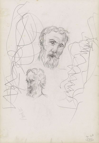 Editor: Here we have James Ensor's "Double Self Portrait," made sometime between 1900 and 1915 using graphite and pencil. The wispy lines give it an ethereal, almost ghostly quality. How do you interpret this work? Curator: Considering the era, and Ensor's own complex relationship with the Belgian art scene, I see a fascinating commentary on the artist's identity and its reception. The double portrait hints at a divided self, perhaps reflecting the tension between how Ensor saw himself and how the public perceived him. Do you think the choice of humble materials like pencil is significant? Editor: I do. Using readily available materials emphasizes accessibility, almost a challenge to the elite art establishment. It democratizes the image-making process. Curator: Exactly. Ensor often critiqued societal norms and the art world itself. By depicting himself twice, and in such a raw, unpretentious manner, he subverts the traditional, often self-aggrandizing nature of self-portraiture. The gaze seems introspective, questioning. Editor: That makes sense. I initially just saw a sketch, but knowing the social context adds layers of meaning about the artist’s struggle for recognition and his commentary on the art world. Curator: Right, art doesn't exist in a vacuum. The drawing itself becomes a statement against established artistic conventions, reflecting the social and political climate of its time. What I find fascinating is how Ensor prefigures later debates about artistic authenticity and the artist's role in society. Editor: I’ll definitely be thinking differently about Ensor and Expressionism from now on. Curator: Excellent! This deeper engagement reveals how much social commentary and identity construction are embedded in a simple graphite drawing.