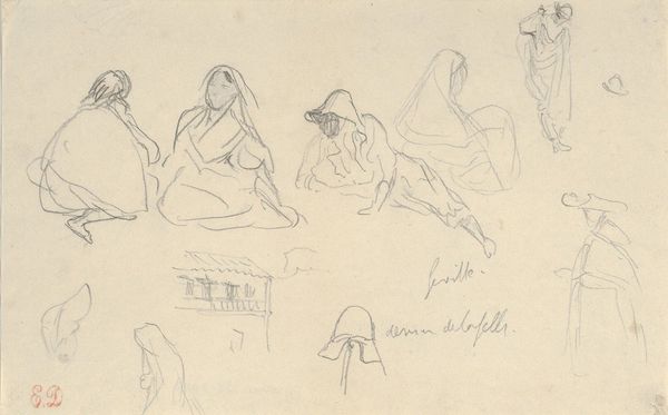 Editor: This drawing is entitled *Trois esquisses de femmes,* by Narcisse-Virgilio Diaz, and it seems to be a pencil drawing. The image depicts three different sketches of women, seemingly caught in moments of labor or repose. There's a certain weightiness to their postures. What can you tell me about this work? Curator: These types of studies, although not inherently political, open a fascinating window into the artistic process and social context. Diaz, while known for his Romantic landscapes, also sketched figures, especially those of the working class. How do you think portraying working women was seen in 19th century France, particularly with increasing visibility and discussions of labor conditions? Editor: I imagine that showing women working, instead of the usual wealthy or mythical figures, was at least a subtle comment on society. Was Diaz making a broader point, maybe about the role of women? Curator: Perhaps not a deliberate manifesto, but his sketches, exhibited in the context of increasing social realism, participates in that trend of validating women's work. He elevates the everyday by giving it his artistic attention, inviting us to really *see* these figures who often remain unseen by the upper classes. This reflects shifting socio-political tides in artistic circles, wouldn't you say? Editor: I see what you mean. It wasn't necessarily an explicit statement, but putting these images on display at all added to a growing dialogue. I never would have looked at it this way, I was just thinking about composition and form, rather than the historical meaning of the art itself. Curator: Precisely. Consider how even seemingly apolitical choices reflect and influence the culture around them, particularly regarding social classes.