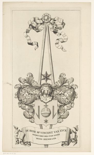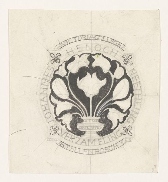 Curator: Here we have Reinier Willem Petrus de Vries' "Vignet met twee leeuwen die een ovaal vasthouden," created sometime between 1884 and 1952. It's an ink drawing. Editor: It strikes me immediately with its formal heraldic feel, though simplified and flattened. Almost like a woodblock print. Stark contrasts. What do you make of the drawing’s stark style and imagery, given the period in which it was created? Curator: That period saw significant shifts in artistic sensibilities. De Vries would have navigated changing artistic landscapes. One where traditional heraldry met modern aesthetics. Its linear qualities, remind us of design principles popularized by the Bauhaus, with an emphasis on function and form, breaking away from overtly ornate styles of previous eras. This piece speaks volumes about design trends in commercial art during its time. Editor: And given its reliance on simple tools, like ink, to generate an appealing work... I mean, just consider the pressure needed to achieve such bold lines! Think about the artist at the table or drafting board with just pen and ink; not too dissimilar to the methods and material conditions used in crafting traditional printed signs. It emphasizes the democratizing influence of the printing press on the conception and accessibility of visual imagery. Curator: Indeed. It circulated easily within society—and that accessibility would also tie into its reception and purpose within Dutch culture. It represents both tradition and modernity and is far more than a simple design. The drawing’s symbolism, two lions holding an oval shape, evokes themes of power and unity. Editor: I'm really seeing now how its creation speaks about art's utility, and what sort of artistic skill and labor went into bringing the piece into fruition. I was too taken by the imagery! Curator: Its endurance speaks to the ongoing relevance of historical art to help us negotiate socio-cultural relationships to the public today. Editor: From its meticulous making process to the social forces that the final design mirrors, the lions seem far grander than ink on paper!