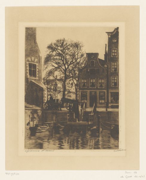 Curator: This print, dating from between 1903 and 1914, is entitled "Huizen aan de Groenburgwal in Amsterdam," which translates to "Houses on the Groenburgwal in Amsterdam," and it comes to us from the hand of Frans Everbag. Editor: It's incredibly still, almost ghostly. I'm struck by the mirroring effect of the water and how that reflection seems to almost solidify the buildings into something monumental, despite their domestic scale. It gives the impression of a very private world made suddenly public. Curator: Yes, the reflections add such an intriguing element. It is, after all, an etching, a print. And the tones that Everbag coaxes from this medium--there's an ephemeral quality to it all, like looking at a memory of the city. I find myself pondering those Dutch Golden Age influences and that tradition of cityscape portrayal in this print. But what story are these houses telling in the modern world? Are they whispers of a mercantile past, ossified and quaint? Editor: Possibly, though I wonder if the artist saw the reflections as evidence of environmental impact: How these architectural legacies impose themselves not only on the physical landscape, but distort nature too. Curator: You raise a compelling point, considering what these canal houses might symbolize regarding power and privilege through generations. And yes, seeing the reflections with that viewpoint does deepen that feeling. Still, beyond that socio-political narrative, I also find that there is an element of whimsy here! Maybe it is in the slightly askew nature of some of the lines or just the sheer repetition. I can almost hear the echoes of daily life rippling out from behind the facades. Editor: Definitely! The piece presents this beautiful tension, then: these weighty histories conveyed with the lightness of a fleeting glimpse. The print doesn't resolve that conflict and it leaves one to ponder our role in this urban tapestry. Curator: Well said! It is a lovely question to take away. It captures both the material reality and an abstracted reflection of it, something that feels incredibly fitting. Editor: I'd agree. This etching captures not just a place, but an inquiry into how that place shapes those who inhabit it and beyond.