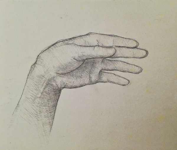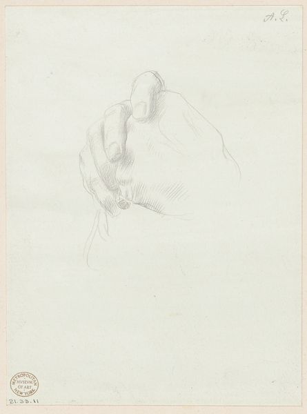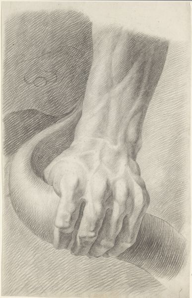 Curator: This delicately rendered drawing, dating from between 1830 and 1833, is entitled "Studie af hånd," or "Study of a Hand" and is attributed to Dankvart Dreyer. It resides here at the SMK, the Statens Museum for Kunst. What's your immediate reaction? Editor: An interesting study in grey. I’m struck by the subtle rendering of light across the fingers—the softness achieved purely through pencil strokes is rather beautiful. Curator: It is quite remarkable. Considering Dreyer’s social context—the burgeoning art academies of the 19th century and the increasing professionalization of art—studies like these were critical. Artists needed to master anatomy and form before tackling grander historical or mythological paintings. Editor: Precisely. Look at how the shading defines the bone structure, hinting at the tendons beneath. There is this emphasis on capturing the essence of form itself. It almost transcends being simply a hand. It becomes about pure representation. Curator: Do you see how this could have been used as preparatory work? Perhaps a sketch toward depicting laborers or maybe biblical scenes that had to become realistic, reflecting the world around them. The hand became more than an appendage. Editor: Possibly, although that also could apply more broadly to Realist movements when such a close study could almost be presented for observation. We see it as part of his development as an artist during the time period of Realism's birth. Curator: This pencil study allows us to witness that intimate moment of artistic creation in an age of academic study. Its preservation offers valuable insight into the institutional development of art production. Editor: I completely agree! The study exemplifies form and tone but really its pure execution gives it true substance. Curator: Looking at art objects in this way shows that artistic merit is complex and tied up with how an artist's practice operates socially and institutionally. Editor: And a study in hands shows such elegance with shape and material as a demonstration of the artist's command over the fundamentals. Thank you for discussing that, curator.