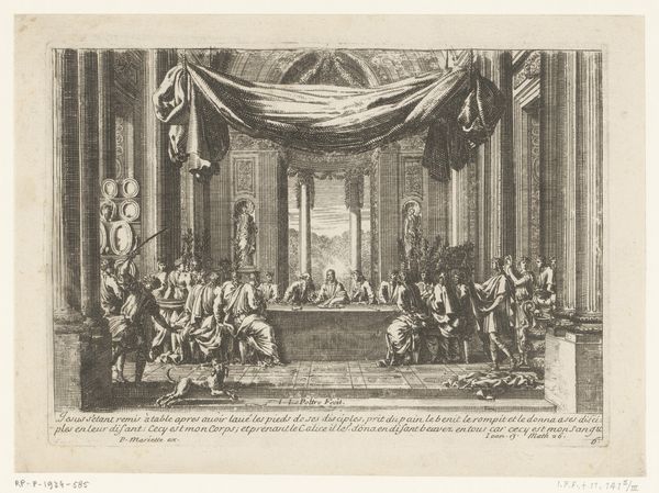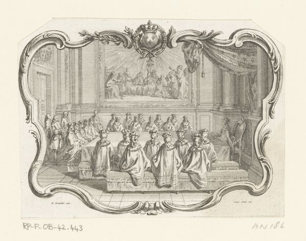 Simon Fokke created this engraving, *Audiëntie van Cornelis Hop bij de jonge koning Lodewijk XV*, in 1719. The monochromatic print presents a formal reception, the composition arranged to emphasize the spatial dynamics and social hierarchy. Note how Fokke’s engraving technique employs fine, deliberate lines to define the architecture of the hall and the figures within it. The stark contrast of light and shadow lends a sense of depth and formality, drawing our eye to the central figures of Cornelis Hop and King Louis XV. The arrangement and size of the figures is deliberately structured to highlight power dynamics and the order of the court. The lines and shading articulate not just the forms but also the underlying structures of political representation. It's an exercise in understanding how visual elements communicate complex social codes. Through careful formal analysis, we begin to grasp the layered meanings embedded in this historical depiction.