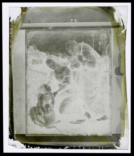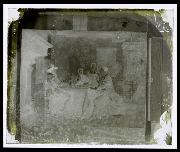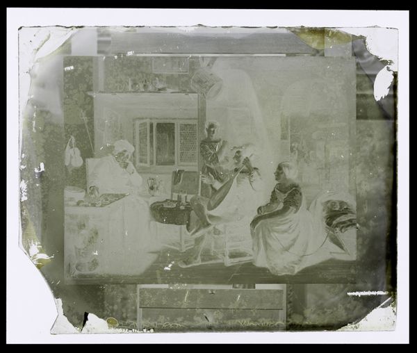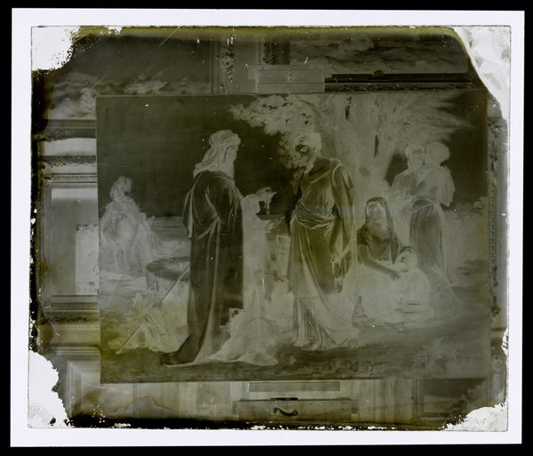 Editor: Here we have a reproduction of a painting dating from 1865 to 1900, a gelatin silver print showcasing a group of people near a well. Its hazy, almost dreamlike quality gives it an air of solemnity. What formal elements strike you the most? Curator: The composition, above all else, is of interest. Observe the strategic arrangement of figures, directing the viewer’s gaze through the pictorial space. Light and shadow are not merely descriptive; they become structural elements defining form. Editor: So, it's more about how it's put together than what it represents? Curator: Precisely. Note the artist's considered use of line and form; these components are engaged in a dialogue that constitutes the artwork's essence. Editor: The figures are arranged around a light area near the well. What would you say about it? Curator: That bright zone certainly serves as a focal point, acting almost as an aperture through which we perceive the narrative elements within. The disposition of bodies around the well orchestrates visual rhythm. Editor: The photograph captures a painterly quality, a soft focus which affects the perceived depth. How do you read that? Curator: It invites contemplation on the nature of representation itself. Is it the indexical function of photography at play, or is it an intentional blurring of boundaries to emphasize form over content? What are your thoughts? Editor: That's a complex thought, indeed. Thanks to your reading I’m now more conscious of the composition and its different levels. Curator: And I’m grateful for your curiosity about it. Close looking reveals fresh insights each time, isn't it?