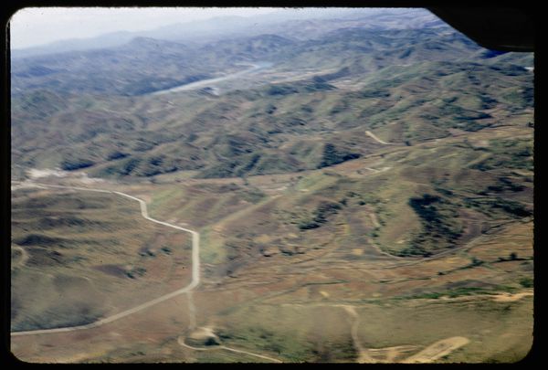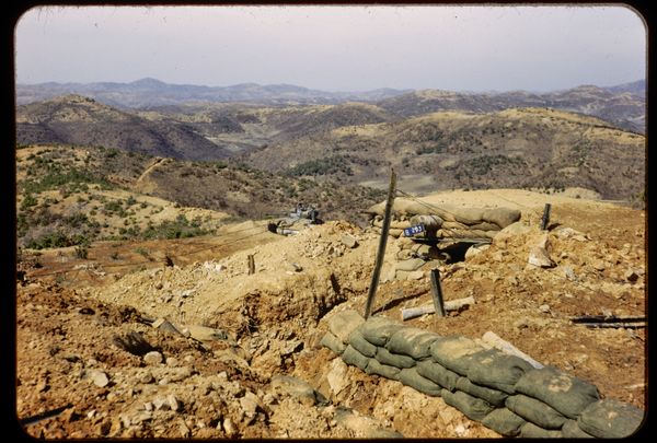 Editor: So this photograph, "Front in Korea" by David Ketel, was taken in 1952. It’s currently held at the Rijksmuseum. It looks like it's a landscape with a soldier in the foreground, overlooking hills that fade into the distance. I’m struck by the stark contrast between the natural beauty of the landscape and the implied tension of the wartime setting. How do you interpret this work from a formalist perspective? Curator: From a formalist point of view, I would focus on the composition. Note the way the photograph uses linear perspective. The arrangement creates depth. Consider how the lines of the landscape and the positioning of the soldier's figure draw the viewer's eye through the planes. Do you observe a certain repetition? Editor: Yes, the layered hills receding into the background seem to echo each other. Is that repetition significant? Curator: Precisely. The rhythmic repetition within the natural forms, punctuated by the verticality of the soldier, establishes a visual order. Consider the geometric relationships – the rectangular form of the sandbags versus the softer curves of the hills. What do these relationships suggest? How does that interplay create tension or balance within the photograph itself, regardless of its historical context? Editor: I see now, it's less about the "what" and more about the "how." The relationships create visual harmony despite the chaotic setting. Looking at it this way gives it such a different feel than if I were focusing on it being a war photo. Curator: Indeed. Through line, form, and composition, the artwork exists as a self-referential object that generates its own meanings through these intrinsic, internal elements. Editor: I've definitely learned a new appreciation for purely visual analysis. It helps peel away layers and discover inherent value, even if the context alludes me.