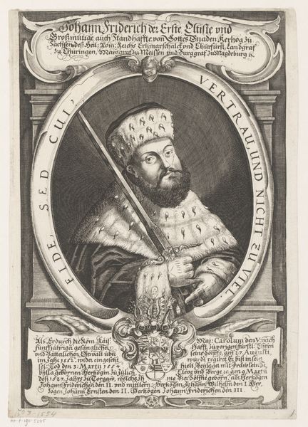 Curator: The work before us, titled "Portret van Georgius Wirth," was crafted between 1597 and 1599. It’s an engraving by Robert Boissard, currently residing here at the Rijksmuseum. Editor: Immediately, I'm struck by the intensity of detail—almost overwhelming in its commitment to representing texture. The ruff collar alone! And the way the light plays across the fur… it suggests a real opulence, doesn't it? Curator: Precisely. Note the composition. The oval frame, filled with detailed text and floral elements, serves to highlight the central figure. It draws our eyes immediately to Wirth's direct gaze, which conveys a sense of gravitas and intellectual authority. Semiotically, consider the deliberate inclusion of symbolic ornament framing his likeness. Editor: And what of Wirth himself? His attire and the tools he holds suggest something about his status and occupation. It feels as though the engraving is also an attempt to visually communicate Wirth’s achievements. How were such prints produced, disseminated and used to cultivate authority in the period? The layering of his robes communicates more than just status: their careful making indicates considerable work and expense in production. Curator: Indeed. Robert Boissard employed meticulous line work to capture the subtleties of light and shadow. The linear nature of the engraving, a hallmark of the Northern Renaissance, allowed for mass production, democratizing the portrait and enabling wider circulation. Observe the frame itself, laden with floral garlands; a deliberate inclusion designed to symbolize knowledge. Editor: The act of reproduction seems crucial. I wonder about the division of labor required for prints such as this. Who was cutting these lines and to whose economic benefit did this likeness circulate? Also the paper itself, was it sourced locally and how does its texture play off the lines of the engraving? Curator: Questions of value are precisely what we should ask ourselves as viewers! Boissard offers a snapshot into a highly-refined, technical art. It showcases a capacity to reproduce realistic textures that alludes to his skillset as an engraver. Editor: The close study of materials always deepens the viewing experience for me! Looking closely at the textures and techniques used, I come away with a deep appreciation for the skilled labor involved. Curator: For me, it illuminates how structure and formal choices can construct and disseminate meanings about status, intellect, and cultural significance.
