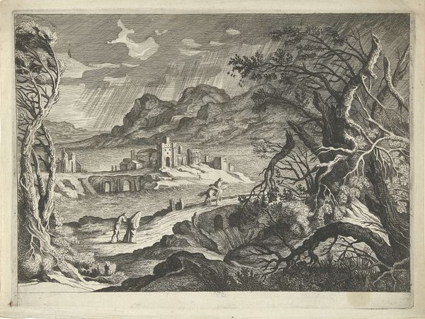 Johannes van Doetecum I created this print of The Penitent Magdalene from The Large Landscapes. The image shows the figure of Mary Magdalene in the bottom right corner, a religious figure known for repentance. This print, made in the Netherlands, reflects the religious and social environment of the 16th century. The detailed landscape with its rolling hills, forests, and distant towns highlights the cultural value placed on the natural world. The inclusion of a religious figure within this landscape invites viewers to contemplate the relationship between humanity, nature, and the divine. Consider how the print uses visual codes, such as the contrast between the wilderness and the distant town, to create meaning. What might this contrast suggest about the social values and beliefs of the time? Researching the history of landscape art and the role of religion in 16th-century Dutch society can provide greater insight into the print's broader cultural and historical context.