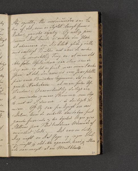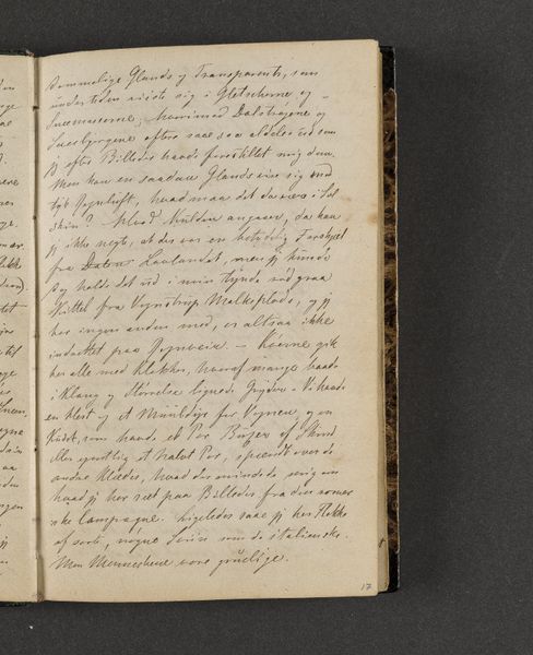 Curator: Today we're looking at "Rejsedagbog," or "Travel Journal," dating back to 1845, by Johan Thomas Lundbye, housed at the SMK, the National Gallery of Denmark. It's primarily ink on paper, revealing delicate script. Editor: It immediately strikes me as intimate, like eavesdropping on a private moment. The close crop enhances that sense, doesn't it? The paper seems almost fragile. Curator: Absolutely. Lundbye’s journal offers a unique window into the 19th century—specifically, into the travel experiences and reflections of a Danish artist deeply engaged with his surroundings. Consider the sociopolitical context. Travel was becoming increasingly accessible yet remained a privilege, shaping perspectives. Editor: Focusing on form, the artist’s choice of a small, bound journal is significant. The deliberate act of writing, the linear progression, creates its own visual rhythm. It encourages a sequential reading; you see thoughts evolving, ideas taking shape in real time. The hand is the instrument, the script the product of the mind and the social customs in its structure and appearance. Curator: And what thoughts! Beyond simply logging daily events, Lundbye recorded his observations about the people he encountered, the landscapes that inspired him. It speaks to Romanticism's influence and the rising middle-class of travelers who desired more than merely aristocratic adventures. Editor: I’m fascinated by the relationship between the seen and unseen. The visible script invites us into Lundbye's world, while the unwritten spaces suggest deeper thoughts, untold stories. The material presence of the paper and ink enhances that invitation. Curator: Ultimately, "Rejsedagbog" encapsulates the intersection of personal experience, artistic practice, and the burgeoning travel culture of its time, making it more than a book of observations. Editor: Indeed. It offers insights into both the journey and the very nature of recording a journey, both visually and literally revealing that one never looks at something the same way, before and after.
