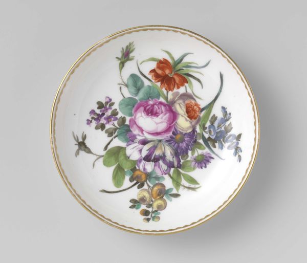 Editor: This is the lid of a tureen, created sometime between 1777 and 1790 by the Porseleinfabriek Den Haag. It’s made of porcelain and part of the decorative arts. I’m immediately drawn to the almost overwhelming abundance of the fruit and floral arrangement. What strikes you most when you look at it? Curator: It’s the abundance that resonates most strongly, you're right. Look closely, and you see that each individual element is rendered with such meticulous detail. What do you think this celebration of earthly delights might represent during that time? Editor: Well, seeing that it's rococo, perhaps it's just celebrating the good life, food, beauty and material pleasures? A kind of elegant excess? Curator: Precisely! Rococo often embodies a yearning for a return to simpler times but filtered through the lens of courtly refinement. Note the carefully placed bird, seemingly perched amidst the bounty. Birds often represented the soul and transformation during the era. Do you see any connection between this idea of spiritual elevation and this visual abundance? Editor: Maybe it’s a gentle reminder that even amidst plenty, there's a need for inner peace or a spiritual component. Sort of like a "bread and roses" ideal. Curator: That's a very insightful point! "Bread and roses," indeed. And the fact that this is a terrine lid— meant to contain food – underscores the importance of both physical and, dare I say, spiritual nourishment. This imagery invites the diners into a space of plenty that is, paradoxically, ephemeral. Editor: That makes the piece so much richer – seeing that duality of earthly pleasures with that spiritual, ethereal quality. Thanks for illuminating that for me. Curator: My pleasure! It reminds us how objects from the past can reflect both the tangible and the intangible, offering pathways into cultural memory.