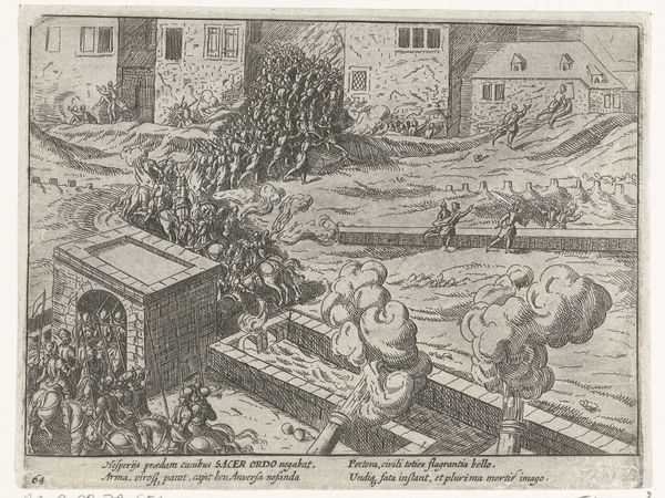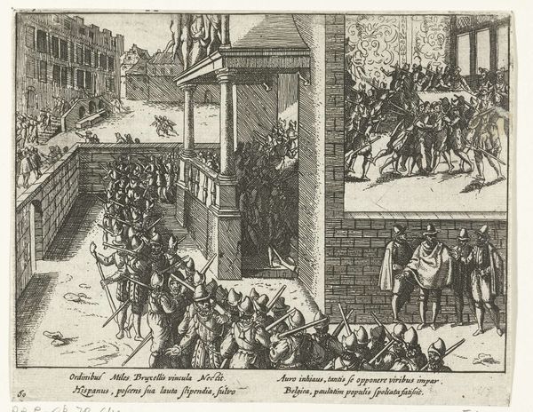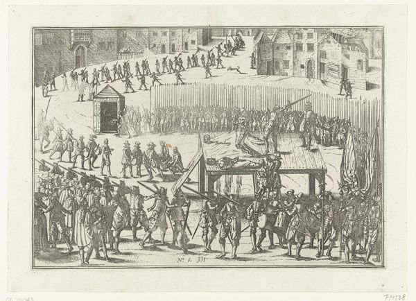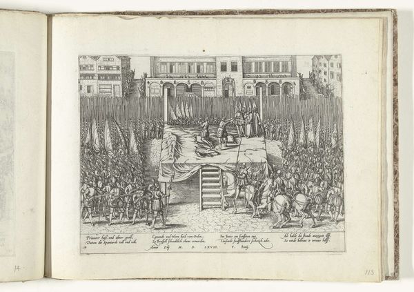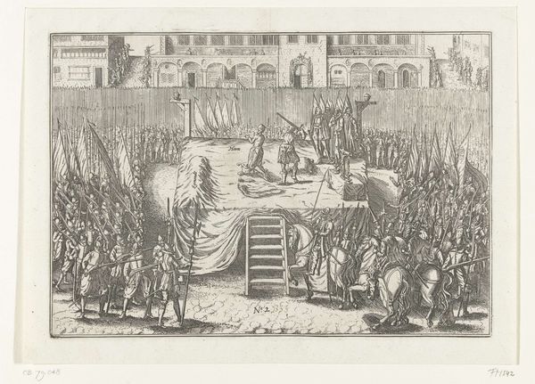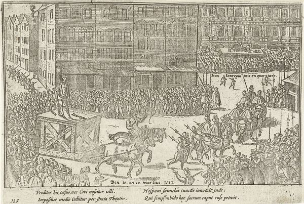 This print, made in 1568 by an anonymous artist, depicts the execution of the Counts of Egmont and Horne. It's an engraving, meaning the image was incised into a metal plate, likely copper, with a tool called a burin. Consider the labor involved: the precise cuts to create the detailed scene, and the skill required to pull each impression. The stark, graphic quality comes from the sharp lines of the engraving. The medium itself speaks to the context. Printmaking allowed for mass production and dissemination of images. This print, therefore, served as a form of political propaganda. Through the reproducible nature of the print, the Counts of Egmont and Horne became symbols of resistance against oppression and tyranny. The relatively humble material and process belie the powerful impact of this image, reminding us that even seemingly simple objects can carry significant weight.